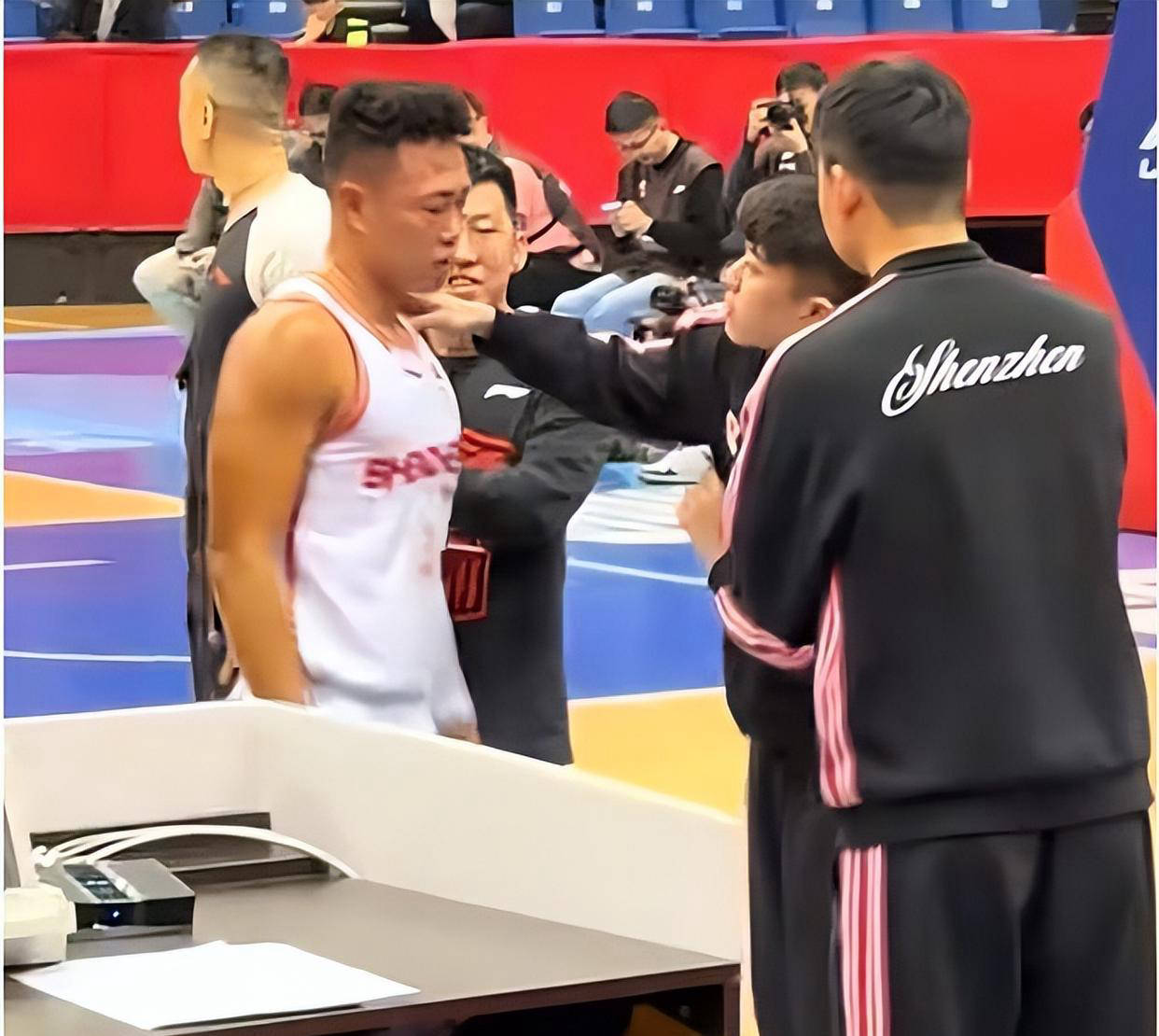 第一节抢篮板时,贺希宁遭青岛球员吕俊虎一次意外击打面部,右眼瞬间肿胀,脸上多处划痕明显,甚至眼睛只剩一条缝。虽然伤势严重,他仅接受简单处理便重新上场。比赛后他坦言“现场头很晕”,但这种坚持令人动容。