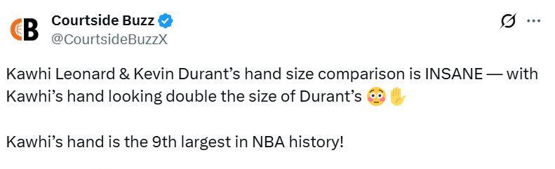 CBA盘口分析,CBA大小分,CBA让分推荐,CBA数据模型,辽宁vs广东盘口/聚焦CBA专业盘口分析:每日更新让分、大小分走势、球队疲劳指数与伤停影响,结合数据模型与风险管理,为中文球迷和投注者提供高质量、可执行的参考。北京时间2月17日,美国体育媒体Courtside Buzz发布了一张全明星赛上科怀·莱昂纳德(小卡)与凯文·杜兰特(KD)握手的照片,并配文称:“科怀·莱昂纳德和凯文·杜兰特的手掌大小对比令人震惊——科怀的手几乎是杜兰特手掌的两倍!”更令人关注的是,小卡的手掌被评为NBA历史上第九大的手,这个数据引发了广大篮球迷和专家的热议。