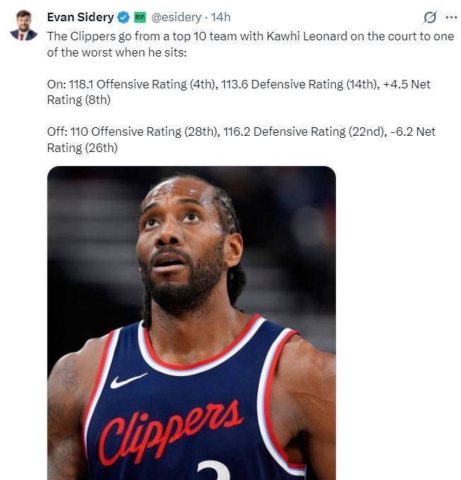 然而,个人数据的巅峰,远不足以概括伦纳德本赛季的全部价值。真正体现他恐怖影响力的,是一组冰冷而残酷的效率对比数据。根据《福布斯体育》记者埃文·斯迪瑞的报道,当伦纳德在场时,快船的进攻效率高达118.1,这个数字可以排在联盟第四位;而当他不在场时,快船的进攻效率骤降至110,这个效率只能排在联盟第28位,也就是倒数第三。防守端同样如此,伦纳德在场时,快船的防守效率为113.6,排在联盟第14位;他下场后,防守效率降至116.2,排名联盟第22位。综合来看,当伦纳德在场上,快船的净效率值为 4.5,这个表现可以排在联盟第八,是一支不折不扣的联盟前十级别球队;而一旦他下场休息,快船的净效率值立刻变成-6.2,这个数据在联盟排名第26位,瞬间沦为垫底鱼腩级别的队伍。这组数据清晰地揭示了一个事实:本赛季的快船,完全是伦纳德一肩扛起的球队。有他和没他,完全是两支不同的队伍。