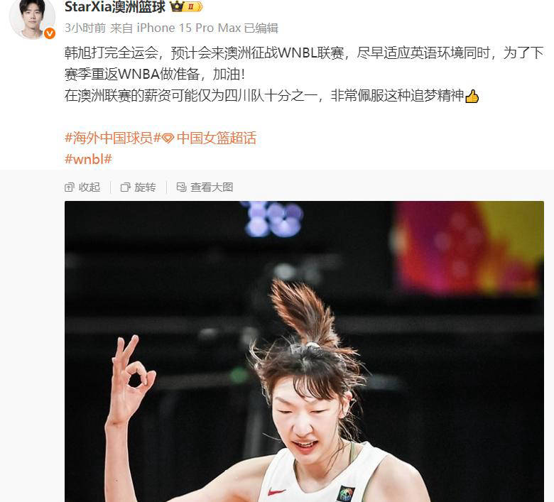 消息称,“韩旭有望在WNBL联赛中展示实力,提前适应英语环境,同时为重返WNBA做准备。而澳洲联赛相较于四川队的薪资可能只有十分之一,这种拼搏精神令人钦佩。”澳大利亚篮球博主补充道。