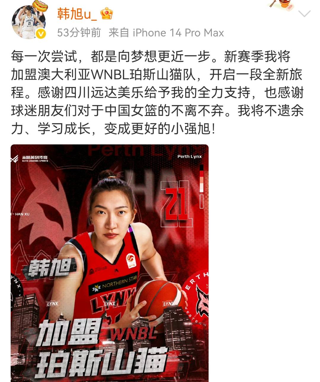 韩旭在社交平台上写道:“每一次尝试,都是向梦想更近一步。新赛季我将加盟澳大利亚WNBL珀斯山猫队,开启一段全新旅程。感谢四川远达美乐给予我的全力支持,也感谢球迷朋友们对于中国女篮的不离不弃。我将不遗余力、学习成长,变成更好的小强旭! ”不得不说,韩旭对篮球的热情非常之高。