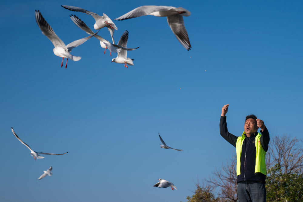 2024年12月11日,志愿者张利云在云南昆明王官湿地公园投喂红嘴鸥。志愿者张利云坚持投喂红嘴鸥长达十余年,为生态环境保护贡献个人力量。