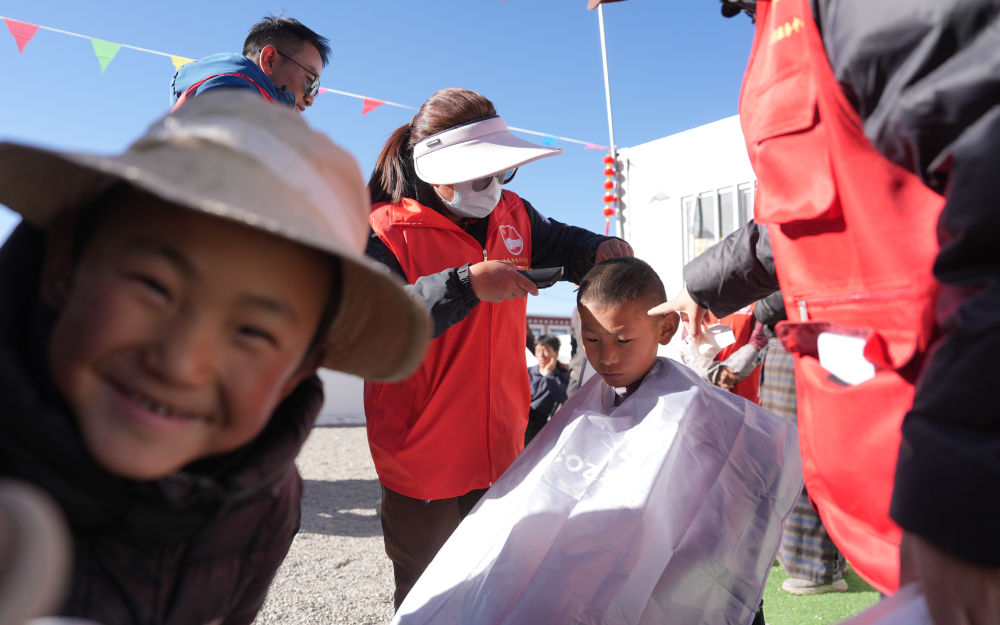 构筑起抢险救灾、守护家园的坚固防线日,志愿者在西藏拉孜县吉如村安置点为孩子们理发。西藏定日县6.8级地震发生后,志愿者们迅速参与救援搜救、协助搭建帐篷、搬运赈济物资、协调村民所需。数百名大学生组成志愿者服务队,白天为安置点的孩子们辅导作业、陪孩子们运动;晚上组成巡逻队,守护安置点的安宁。