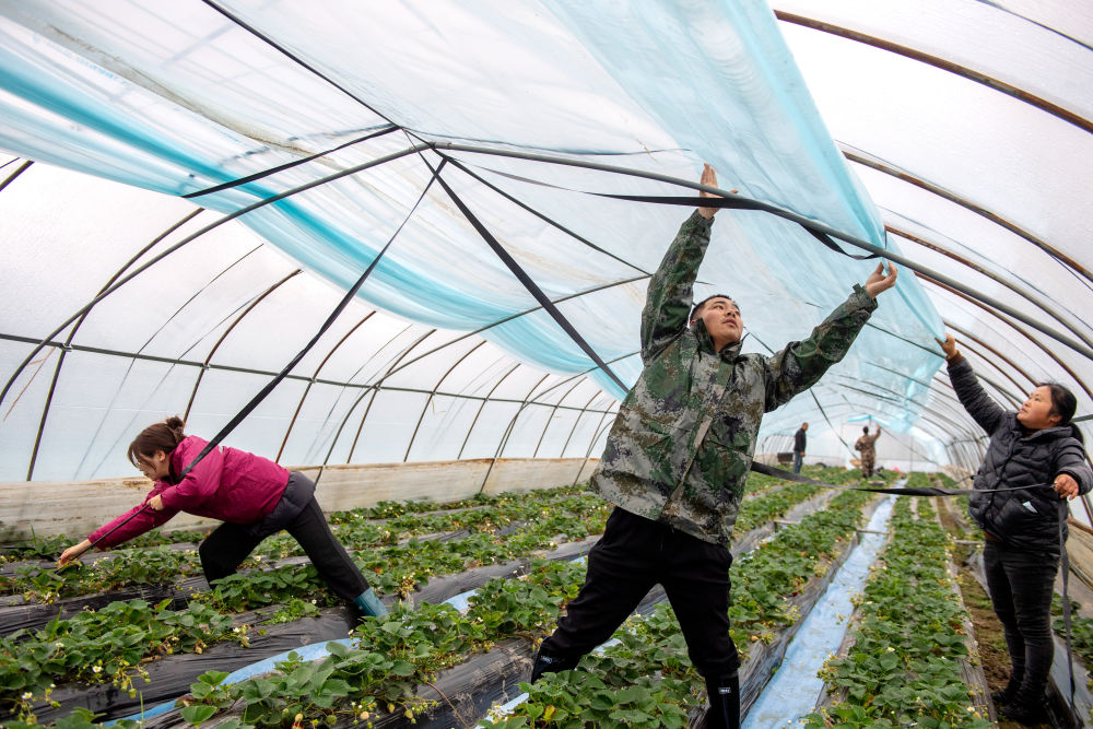 2023年12月15日,志愿者在浙江湖州长兴县水口乡帮助农户加盖大棚保温膜。为应对强雨雪天气,志愿者们帮助农户清理大棚上的积雪,加装绑棚绳,棚内增设立柱,提高大棚抗风雪能力,确保农产品正常生产供应。