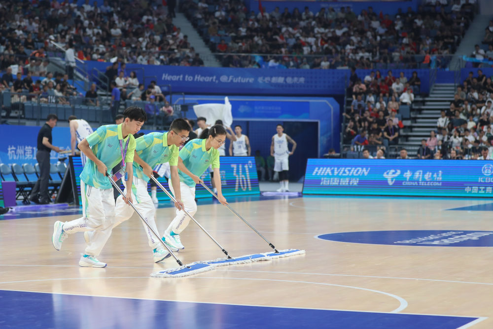 2023年9月28日,杭州亚运会志愿者“小青荷”在杭州亚运会篮球男子预赛B组比赛前清洁场地。从2016年二十国集团领导人杭州峰会以来,“小青荷”这一志愿服务工作品牌已成为杭州大型赛会服务的一张金名片。