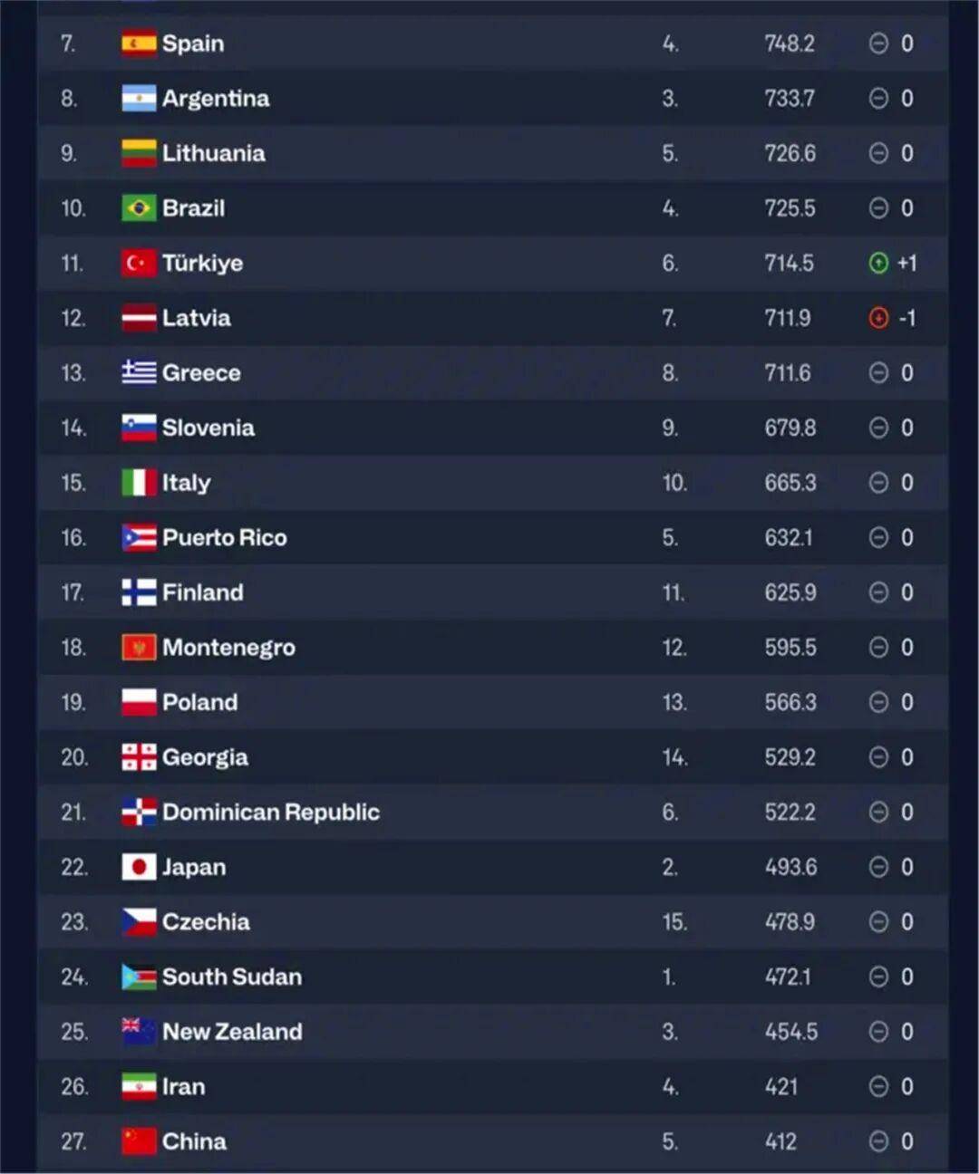 就在国际篮联公布完世预赛亚洲及太平洋赛区实力榜之后,各支球队最新的世界排名也随之出炉。北京时间12月6日,国际篮联公布了最新的世界男篮排名,前十名的位置依旧稳如泰山,分别为美国、德国、塞尔维亚、法国、加拿大、澳大利亚、西班牙、阿根廷、立陶宛和巴西。