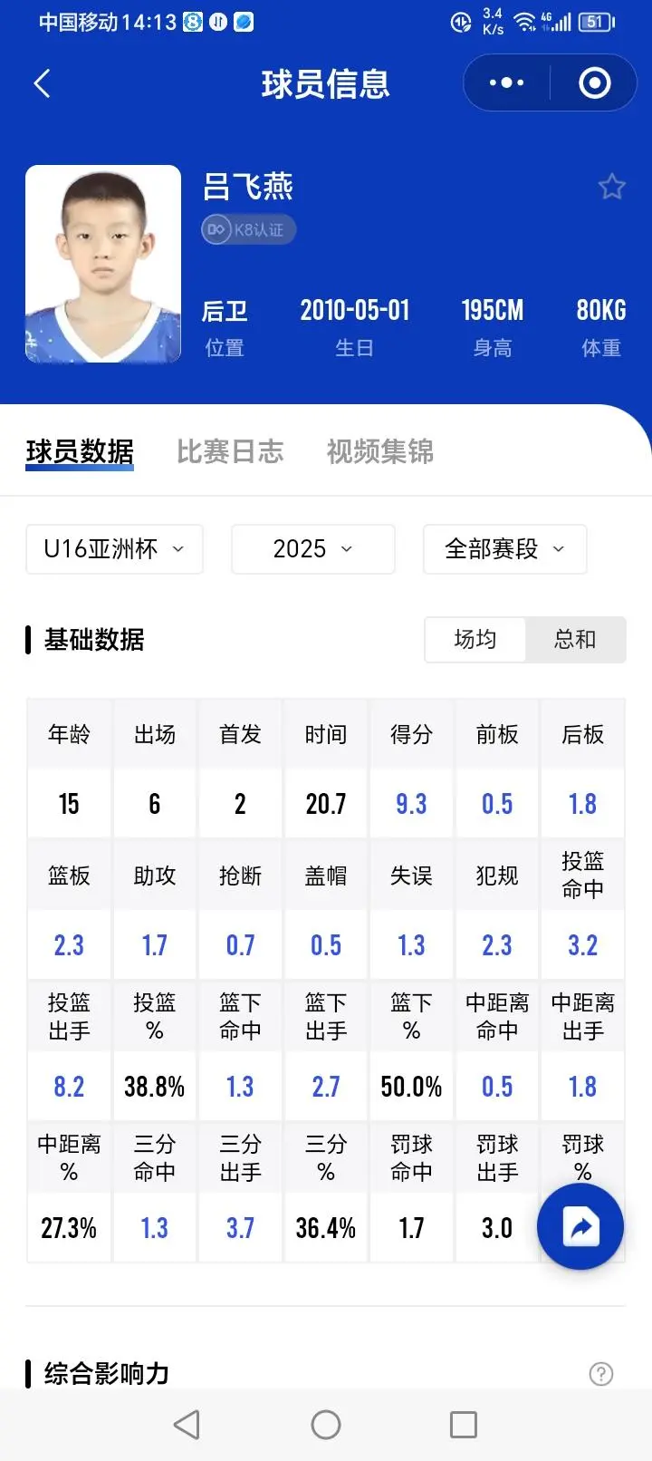 比不了,他16岁都没进国青参加亚少赛,吕飞燕15岁跳级到国青参加亚少赛场均9.3分