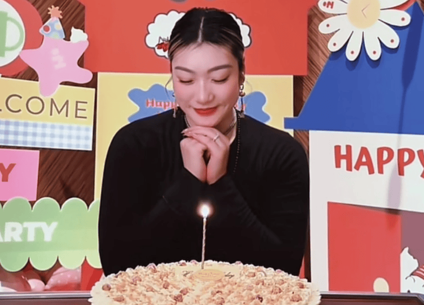 随后旁边有人递过来生日帽,帮李梦戴在头上。之后又有一支燃起来的生日蜡烛出现。李梦插上生日蜡烛,并许愿吹灭蜡烛。之后就是各种颜色的气球飘了起来。